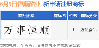 证券之星消息,根据天眼查APP数据显示,近日江苏恒顺醋业股份有限公司新提交1件商标注册申请。商标申请详情如下: